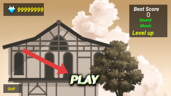 1、画面中显示“PLAY”(开始游戏)按钮,“BestScore0”,还有“Sound”、“Music”、“Levelup”选项,左下角有“Quit”(退出)按钮,背景是房屋和树木的卡通场景。
