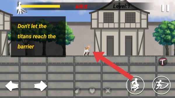 2、显示“kill:0”、“Level:1”,画面中有角色、建筑、树木等元素,下方有方向、攻击等操作按钮,结合“titans”(巨人)元素。