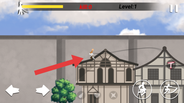 3、界面显示“kill:0”、“Level:1”,角色在建筑屋顶,下方有方向、攻击等操作按钮,从“titans”相关元素及玩法看,是与《进击的巨人》题材相关的跑酷、战斗类。