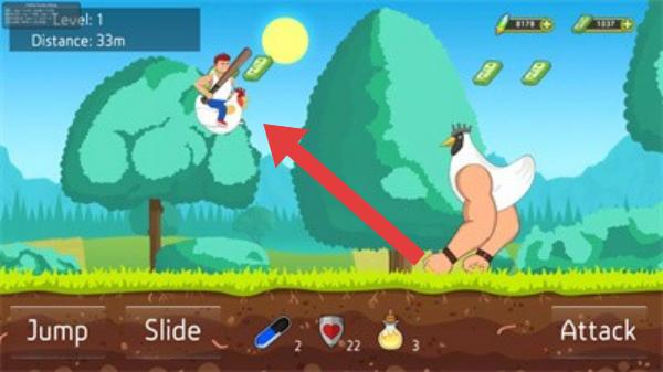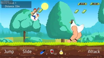 1、界面显示等级、距离,下方有跳跃、滑行、攻击(Attack)等操作按钮,还有类似道具数量显示,画面中有一名手持棒球棍的角色和一个体型巨大的鸡形象敌人。
