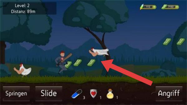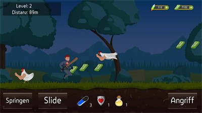2、界面显示等级(Level:2)、距离(Distanz:89m),下方按钮文字是德语,“Springen”表示跳跃,“Slide”表示滑行,“Angriff”表示攻击,还有道具数量显示。