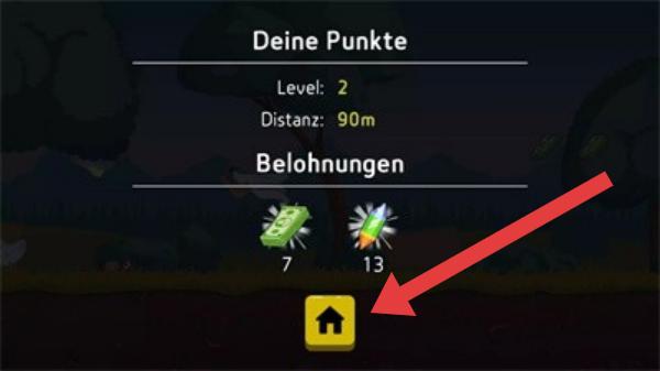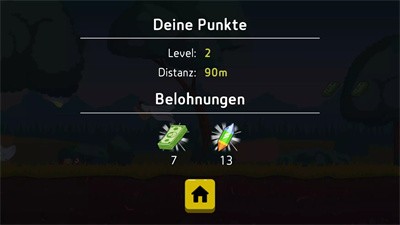 3、“DeinePunkte”、“Level:2”(等级:2)、“Distanz:90m”(距离:90米)、“Belohnungen”(奖励),还有7个金钱图标以及返回主页的房子按钮。