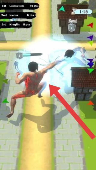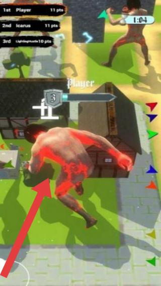 3、画面中角色身上有红色特效,处于战斗场景,左上角显示排名和得分,分别是“1stPlayer11pts”“2ndIcarus11pts”“3rdUraniumium10pts”,场景中有房屋等建筑。