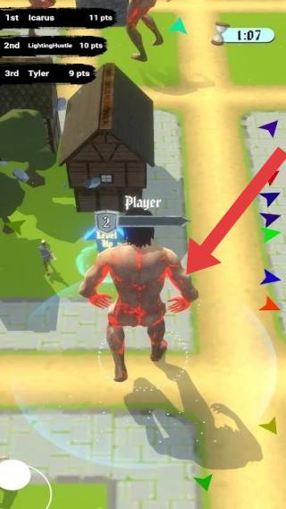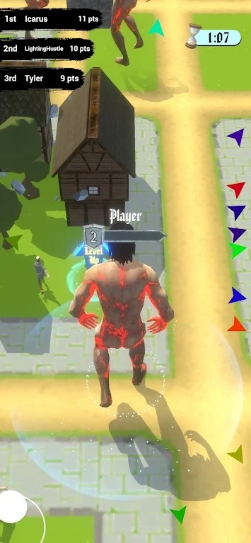 2、左上角显示玩家排名和得分,右上角显示倒计时“1:07”,画面中角色背后有特效,角色上方有“Player”标识,还显示“Levelup”(升级)。