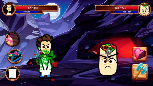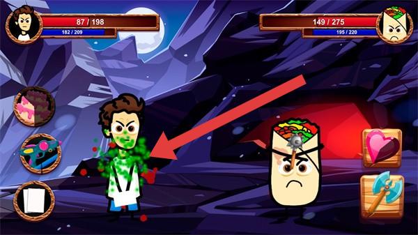 1、左侧是一名角色,身上有绿色特效,是受到攻击;右侧是一个拟人化的墨西哥卷饼敌人形象,画面上方两侧分别显示两个角色的生命值等状态数值。