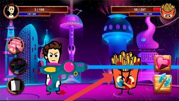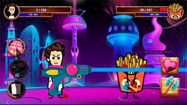 2、玩家操控的角色手持水枪的武器,正攻击一个拟人化的薯条敌人,画面上方两侧分别显示双方角色的生命值等状态数值,背景是充满科幻色彩的城市夜景,左侧有功能按钮。
