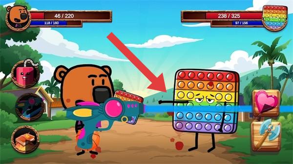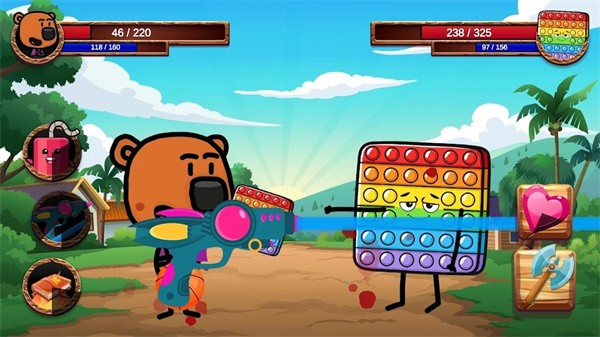 3、左侧是拟人化的棕熊角色,手持喷枪的武器;右侧是一个拟人化的彩色方块敌人,画面上方两侧分别显示双方角色的生命值等状态数值,左侧有功能按钮,背景是户外场景。