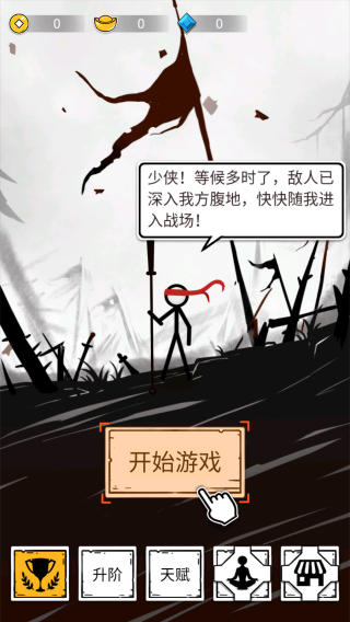 1、画面中有举着旗帜的火柴人角色,上方气泡文字提示敌人已深入,邀玩家进入战场,点击【开始游戏】按钮可启动游戏,还有“升阶”“天赋”等功能按钮。