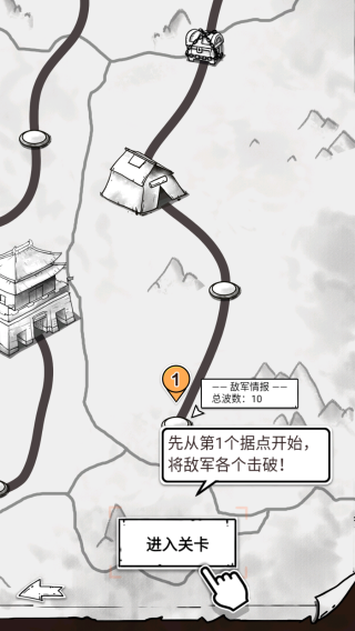 2、呈现出路线、据点,有“敌军情报:总波数10”,提示“先从第1个据点开始,将敌军各个击破”,下方“进入关卡”按钮可开启对应关卡,属于策略战斗类游戏的战前规划环节。