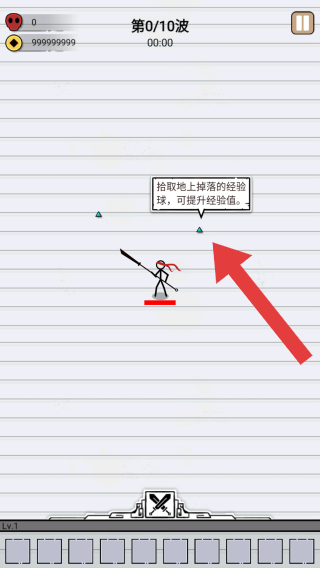 3、呈现战斗关卡场景,有火柴人角色、经验球拾取提示(拾取地上经验球可提升经验值,左上角显示生命值、金币等,属于动作战斗类的战斗环节界面。