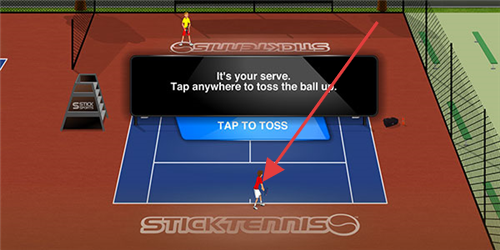 2、发球环节,看到【It's your serve.】提示,点击屏幕任意处【TAP TO TOSS】抛球,完成发球基础操作。