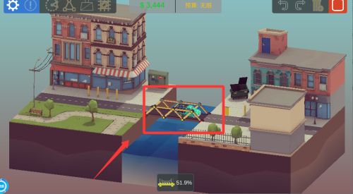 2、通过拖拽、旋转等操作放置桥梁部件,完成后启动压力测试,观察车辆或行人能否安全通过以判定成功。