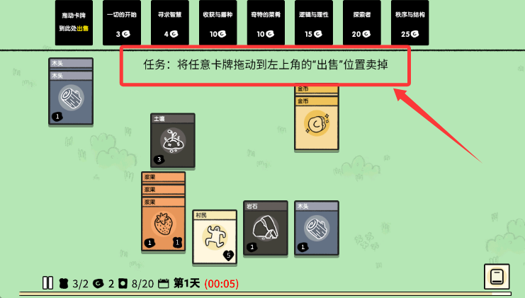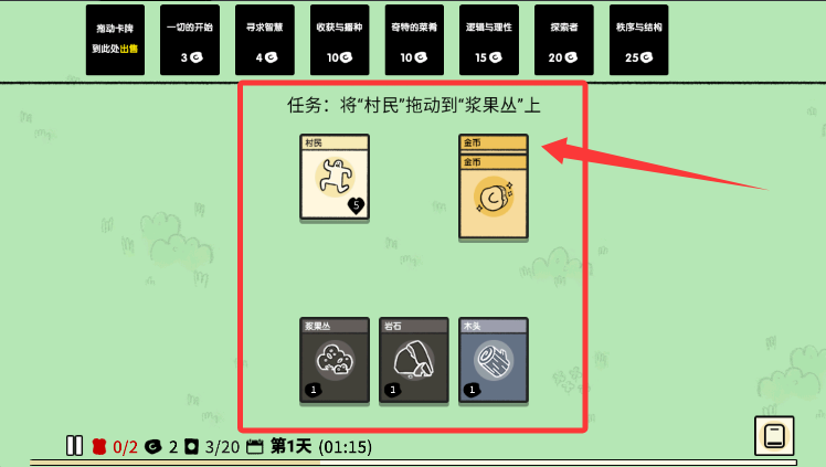 2、将村民卡牌拖拽至资源点,完成采集任务即可获取基础物资。
