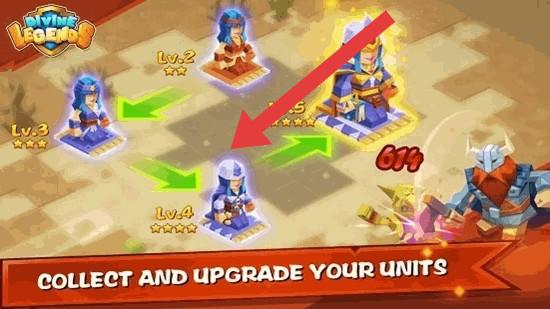 3、单位养成界面,选中箭头指向的Lv.4单位,消耗资源升级,提升战力,搭配部队阵容,继续征战。