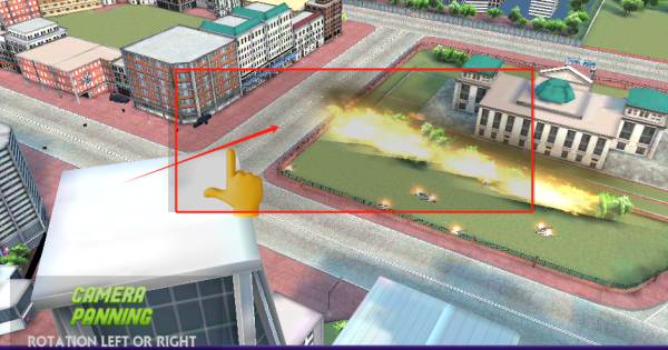 2、用双指滑动屏幕旋转视角,查看城市全景,找到红框标注的绿地中需要处理的火情,为后续行动明确目标。