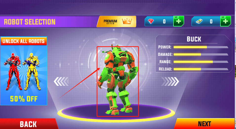3、选择红框里的绿橙配色机器人,查看其右侧的属性(如攻击力、清扫效率等),点击“NEXT”确认选择,完成机器人的初步选定。