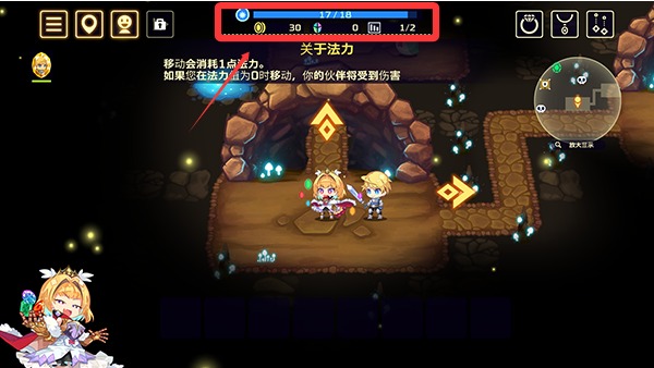 3、每次移动会消耗我们1点法力值,法力值为零时行动将会扣血。