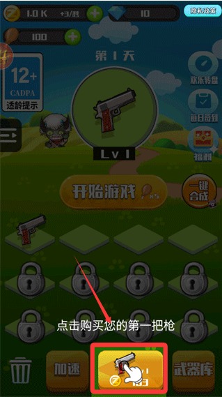 1、开始游戏后首先点击购买我们的第一把枪