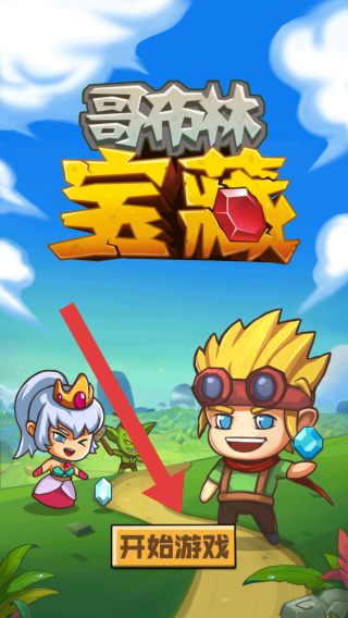 1、画面有【开始游戏】按钮,展示了两个卡通角色,背景是绿色草地和蓝天白云,属于冒险寻宝类。