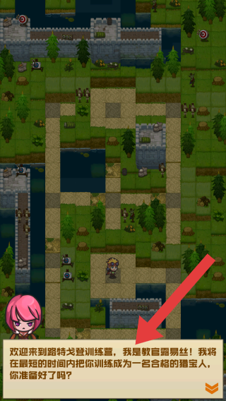 2、显示“路特戈登训练营”场景,人物“教官露易丝”引导玩家,属于像素风冒险养成类,玩家将在训练营接受训练成为猎人。