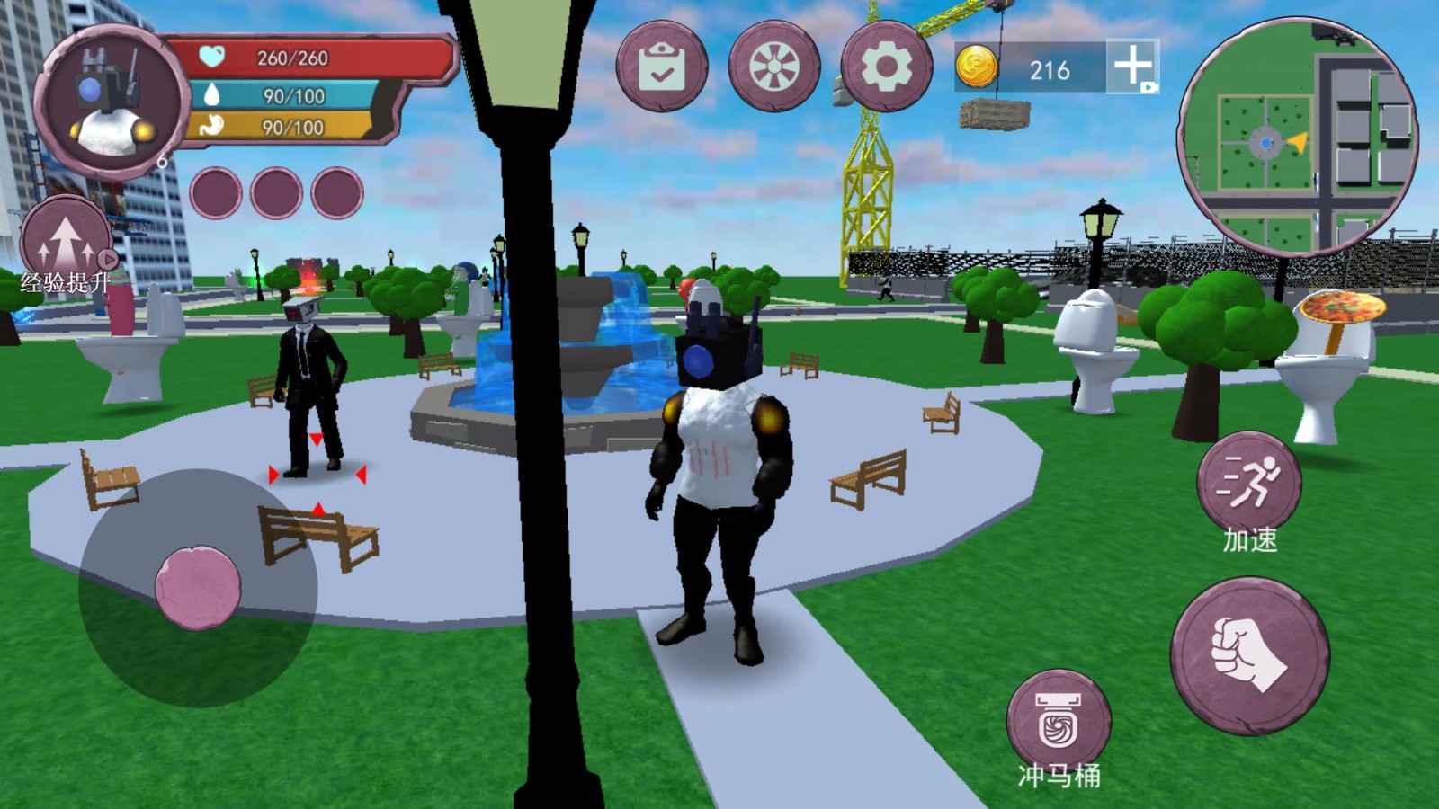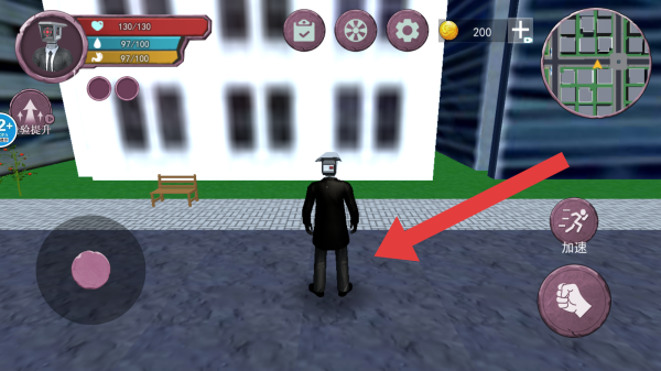 3、角色头顶监控设备,画面有生命值、能量值显示,还有“加速”“攻击(拳头图标)”等操作按钮,以及小地图。