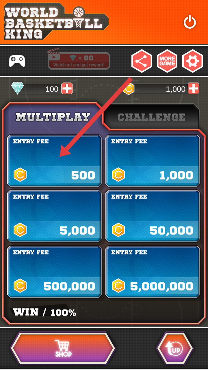 1、进入多人模式界面,选择标注【ENTRY FEE500】的场次,消耗500金币即可参与对战,开启篮球竞技之旅。