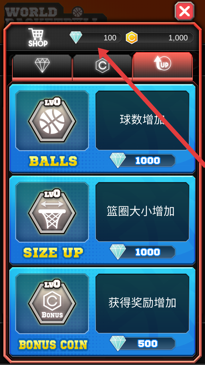 2、进入商店界面,留意上方钻石数量(当前100),可花费钻石升级【BALLS】【SIZE UP】【BONUS COIN】等属性。