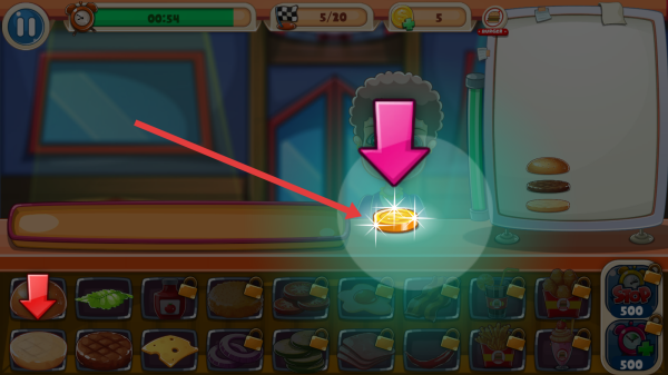3、完成订单后,点击箭头指向的金币,收取费用,积累资金,用于升级食材、扩展店铺。