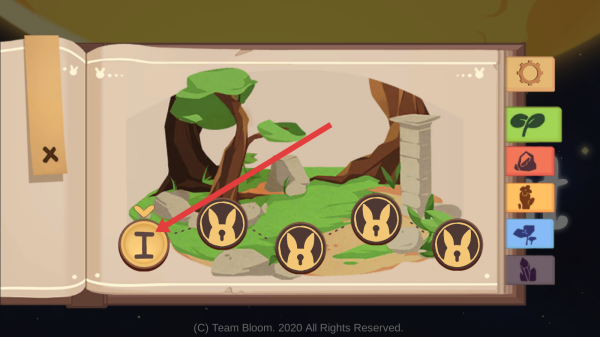 2、可以在地图界面,点击箭头指向的“I”标记关卡,进入森林场景,解锁新冒险,收集道具。