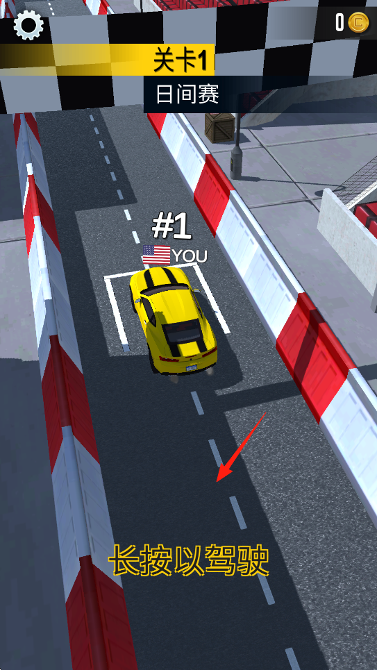 1、进入“关卡1日间赛”,黄色赛车就位,长按屏幕驾驶,控制赛车在赛道加速、过弯,与虚拟对手比拼,利用长按操作把控速度,在直道冲刺、弯道精准转向,争取率先冲线。