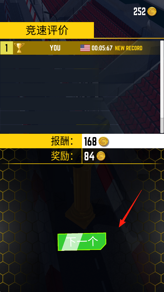 3、赛后进入竞速评价界面,显示夺冠成绩(00:05.67)、金币报酬(168)与奖励(84),点击“下一个”,可开启新关卡,继续挑战更难赛道。