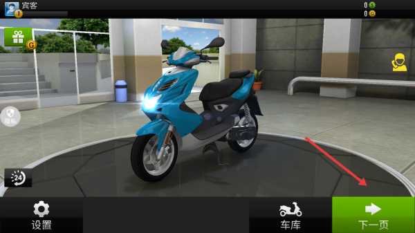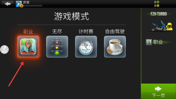 1、在车库界面,点击右下角绿色“下一页”按钮,选定蓝色踏板摩托,进入含“职业、无尽”等模式的游戏模式选择界面。