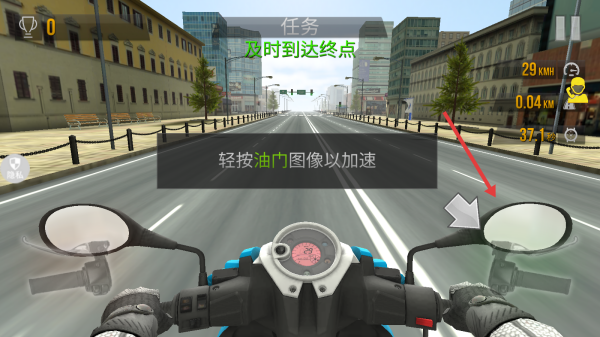 3、驾驶时,按提示轻按油门加速,借虚拟按键控方向,留意时速(29KM/H)、距离,避障碍,及时到达终点完成任务。