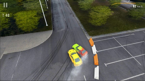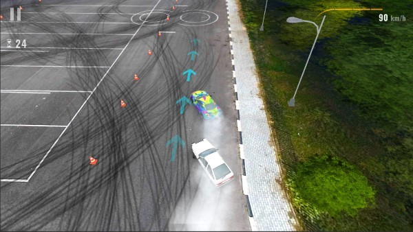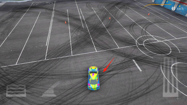 2、在空旷停车场驾驶彩色赛车,利用选定的操控方式(重力或按键),让赛车在地面留下漂移轨迹,通过绕开锥桶、规划漂移路线,积累漂移分数。