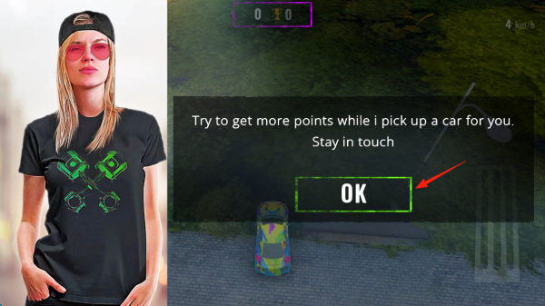 3、完成漂移挑战后,Taty提示“获取更多积分换车”,点击“OK”确认,积分可用于解锁更高级赛车,后续持续参与漂移、竞速任务,积累分数。
