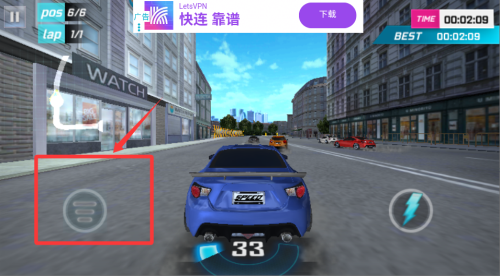 1、进入赛车街道场景,操控蓝色赛车竞速,点击左侧圆形按钮,可切换视角或触发特殊驾驶模式,比如切换为第一人称视角,沉浸式感受贴楼过弯、超车快感。