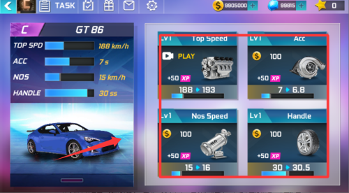 2、在车辆改装界面,针对“GT86”赛车,从“Top Speed”“Acc”等维度升级,消耗金币、XP强化引擎、涡轮等部件,比如升级引擎提升极速,改装涡轮加快加速。
