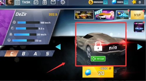 3、浏览车辆收藏库,目标解锁“DeZir”概念车,积累20个蓝色道具(如钻石),点击“+600”按钮兑换解锁资格,解锁后,将其设为“MY CAR”,参与高阶赛事。