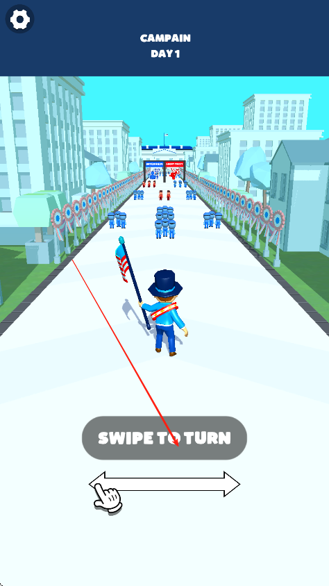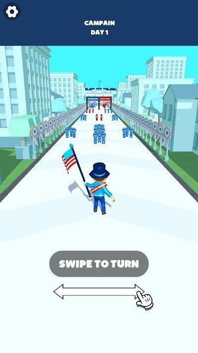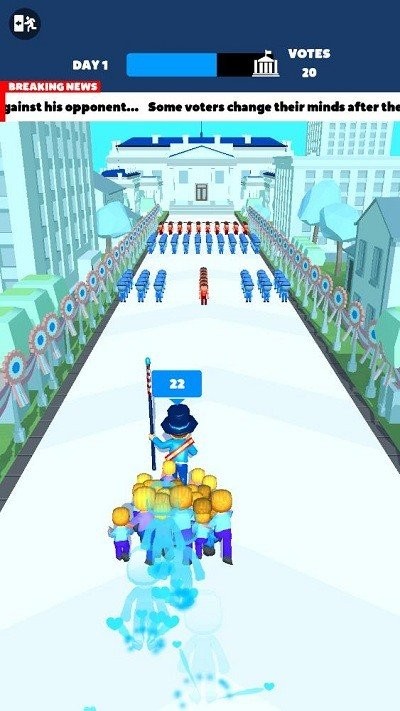 1、进入游戏后操控橡胶人在街道跑酷,左右滑动屏幕收集两侧选民,初期优先扩大队伍规模,为突破障碍积累人数。