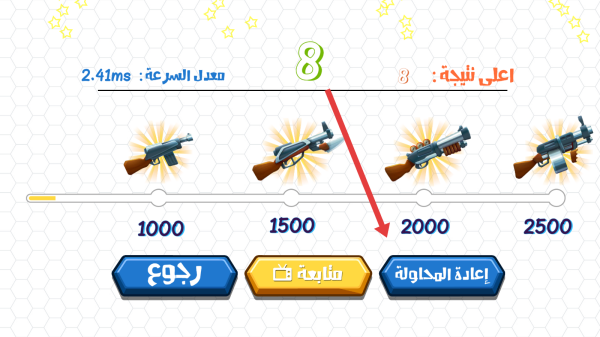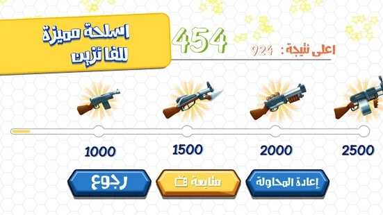 3、结算界面,点击“إعادةالمحاولة”(重试)、“شابةب”(暂存)或“إعادة-المحاولة”(对应2000金币武器),选择升级/重试,强化角色继续挑战。