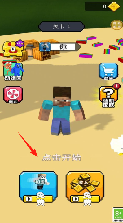 1、在关卡1界面,点击【点击开始】进入冒险,可先看“加速”“收入”广告(免费),提升初始收益或移速。
