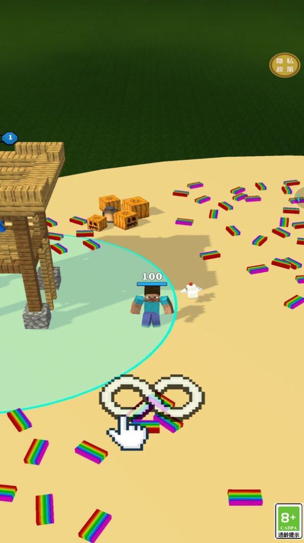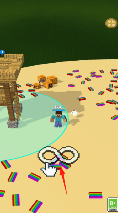 2、进入沙滩场景,按箭头指引【触碰彩色环形道具】,触发效果(如增益、传送),同时收集周围彩虹方块,用于兑换奖励。