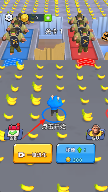 1、在关卡1界面,点击【开始】进入跑酷,沿途收集香蕉,可用于升级(如“移速↑1”),提升角色能力。
