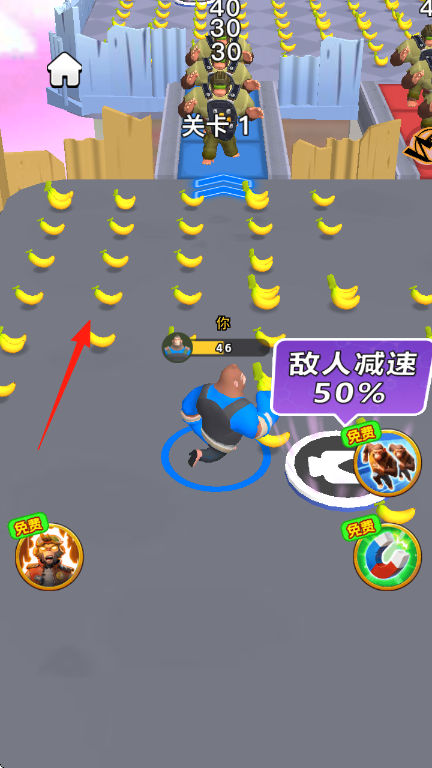 2、跑酷中遇敌人,沿箭头方向【移动躲避】,触发“敌人减速50%”效果后,快速穿过敌阵,同时拾取香蕉。