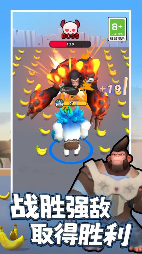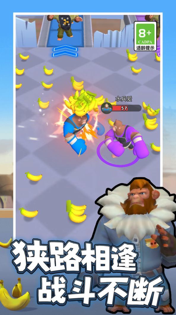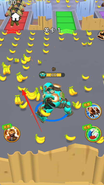 3、收集足够香蕉或触发进化条件后,角色将变身(如机械形态),沿箭头路线继续推进,利用进化后的高战力突破关卡。