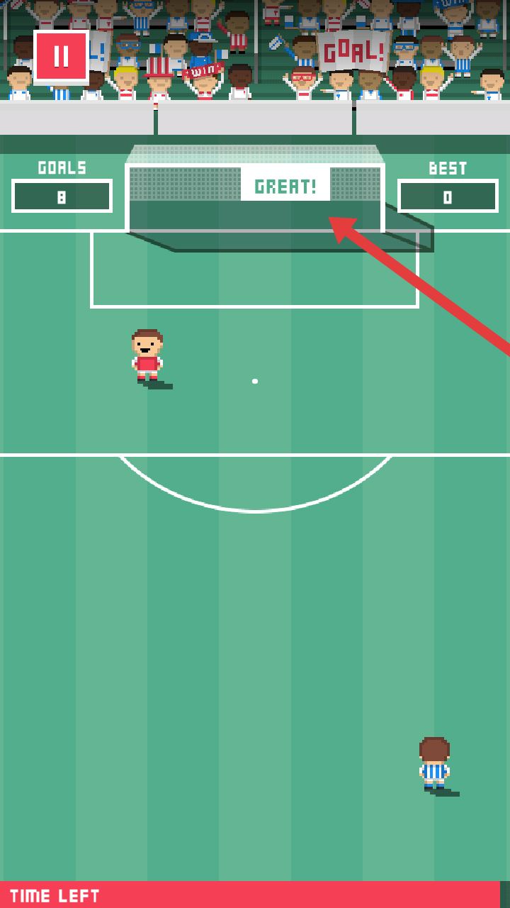3、操控者成功将球射入球门,球门的上方会出现【GREAT】的提示,达成进球目标以推进游戏进程。