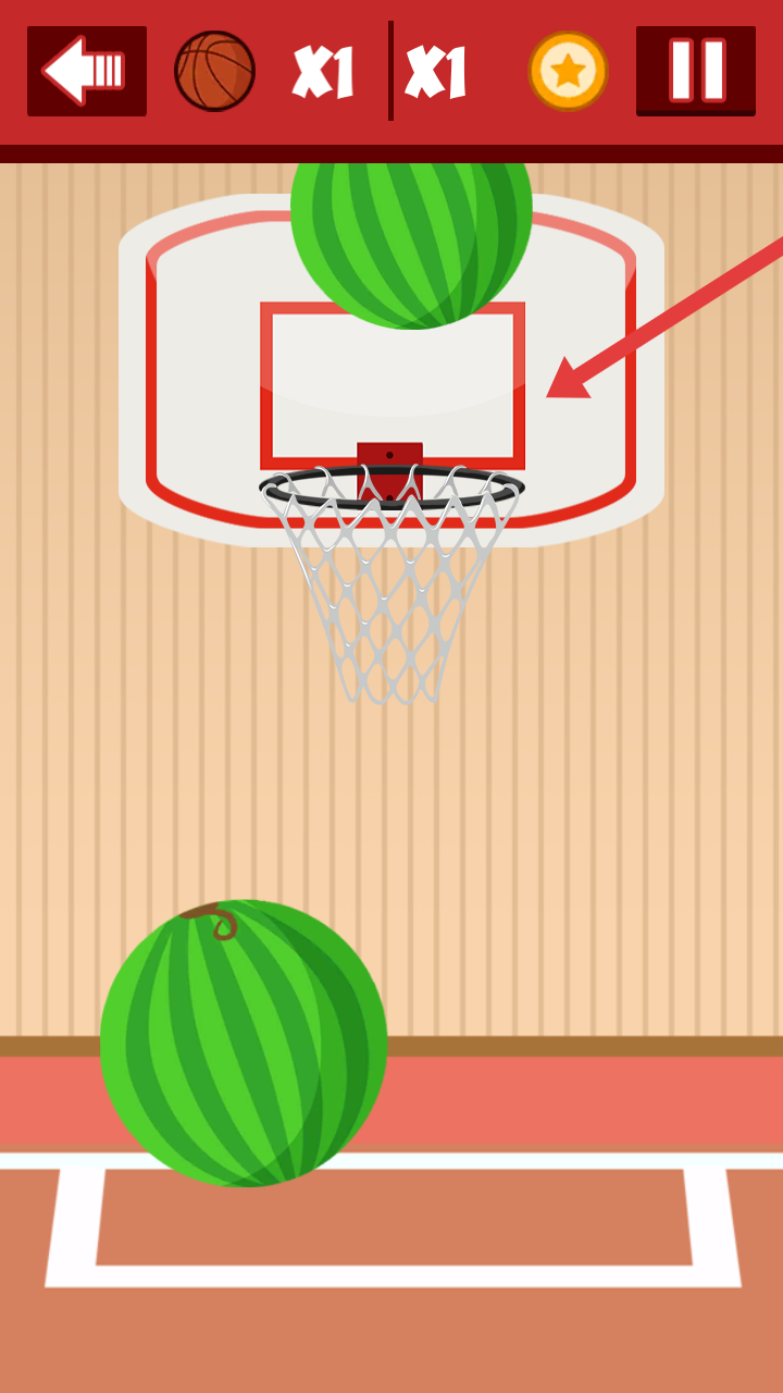 3、在篮球模拟器游戏中操控西瓜球,瞄准篮筐调整轨迹,尝试精准投入篮筐,完成得分挑战。