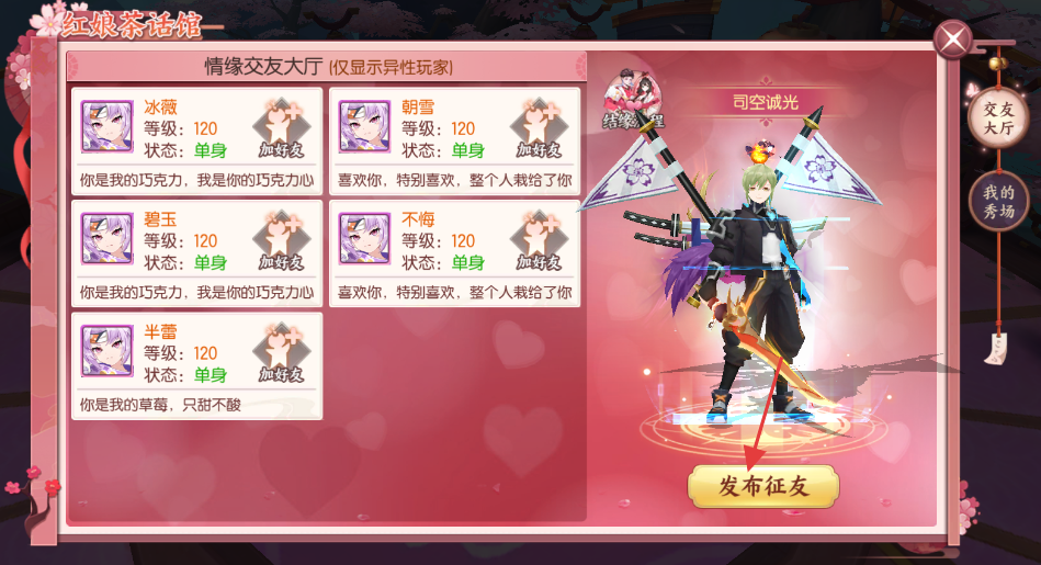 2、情缘交友:进入“红娘茶话馆”,点击【加好友】结识异性玩家,或点【发布征友】填写文案(如“找长期组队伙伴”)。