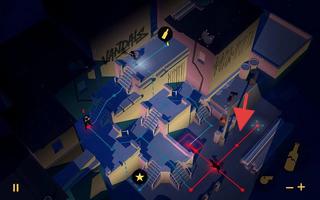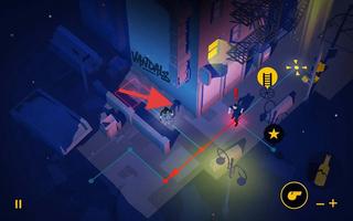 1、“路线规划”,观察关卡场景(建筑、街道)与敌人视野(红色光线),规划潜行路线。