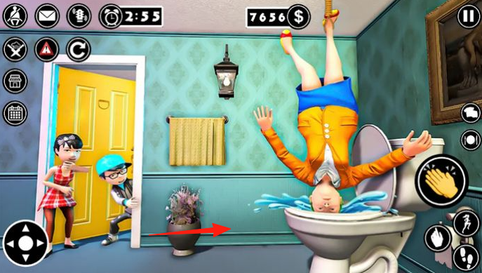 1、在厕所场景,趁人物倒立,观察门口情况,等箭头指向的两人靠近,利用环境或道具(可点击屏幕右侧功能键)触发恶作剧,制造混乱。